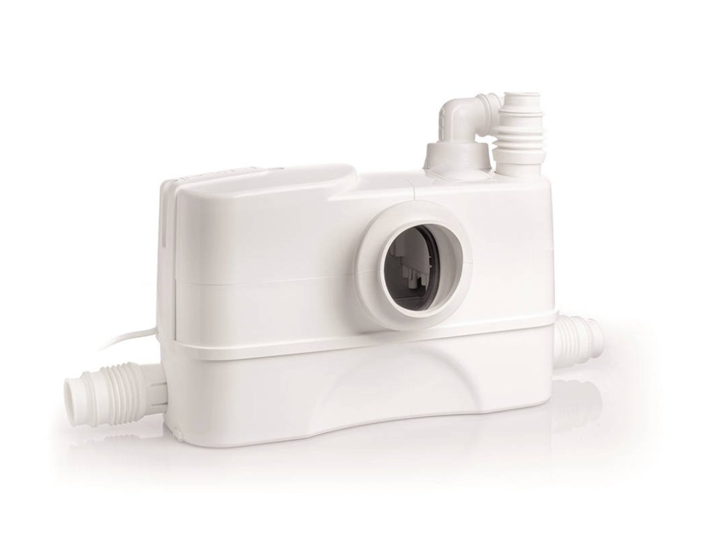 Malé kompaktné prečerpávacie zariadenie pre odpadovú vodu s predným pripojením na WC + sprcha, drez, výlevka, umývačka alebo práčka.