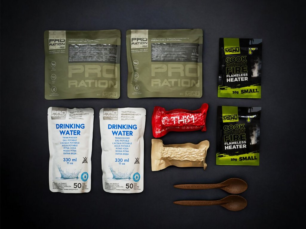 2x hotové jedlo, 2x energetická tyčinka, 2x Pitná voda 330 ml,