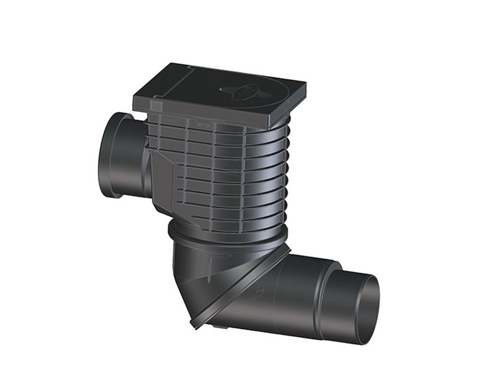 Lapač strešných splavenín s ležatým prítokom a odtokom s kĺbom, s košom na zachytávanie nečistôt, so suchou klapkou.
