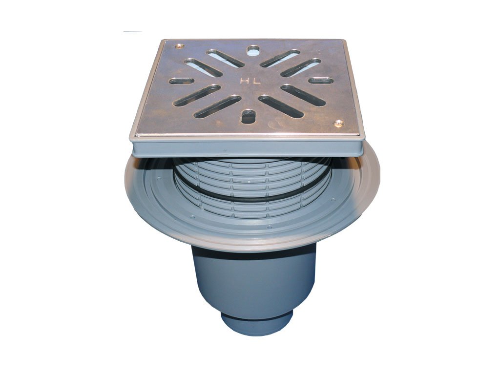 HL616S/5 - Dvorný vpust Perfekt DN160 vertikálny s izolačným tanierom, plastovým rámikom 240x240mm, nerezovou mriežkou 226x226mm, nezamŕzajúcou protizápachovou klapkou