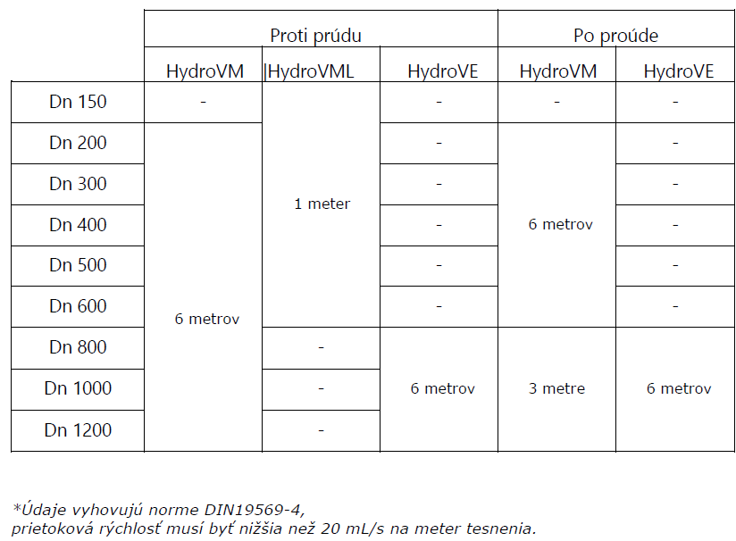 (Uvedené hodnoty sú podľa normy DIN19569-4, rýchlosť prúdenia < 20 ml/s na meter tesnenia)